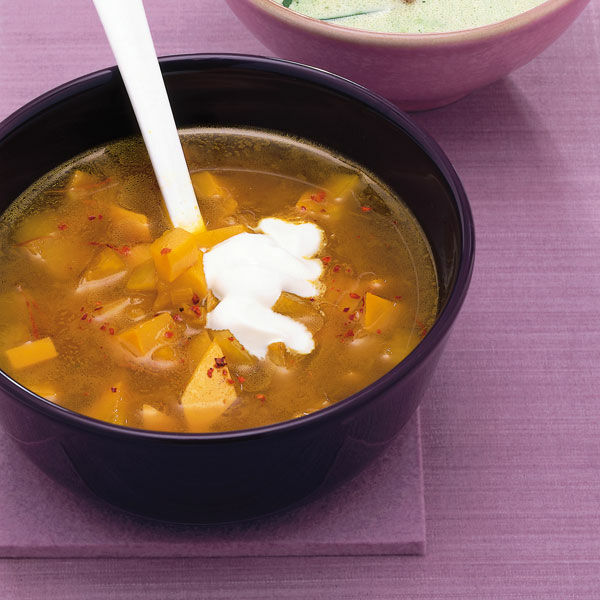 Suppe aufkochen, zugedeckt bei kleiner Hitze 10-12 Min. köcheln lassen, bis das Gemüse gerade gar ist. Mit Salz, Pfeffer, Zitronensaft und -schale leicht säuerlich abschmecken. Creme fraîche glatt rühren, davon kleine Tupfen auf die Suppe setzen und mit Paprikaflocken bestreuen.