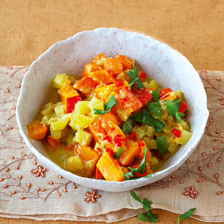 Milder Kürbis, sanfte Kartoffeln und süßliche Möhren freuen sich über würzigen Knoblauch, Zwiebeln, Ingwer und über ein Topping aus Chili und Koriandergrün.