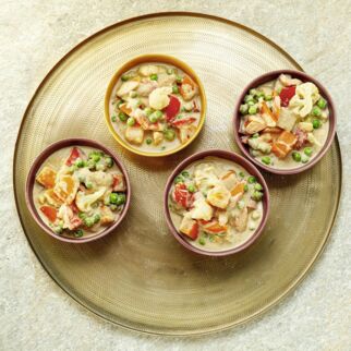 Den Backofen auf 180° vorheizen. Die Hälfte von Reis und Zwiebeln in einen gusseisernen Topf schichten, das Gemüse darauf geben und mit dem Rest von Reis und Zwiebeln abschließen. Biryani mit der lauwarmen Milch beträufeln, mit 1 TL Ghee in Flöckchen belegen und mit Alufolie abdecken. Im Ofen (Mitte) bei aufgelegtem Deckel ca. 1 Std. garen.