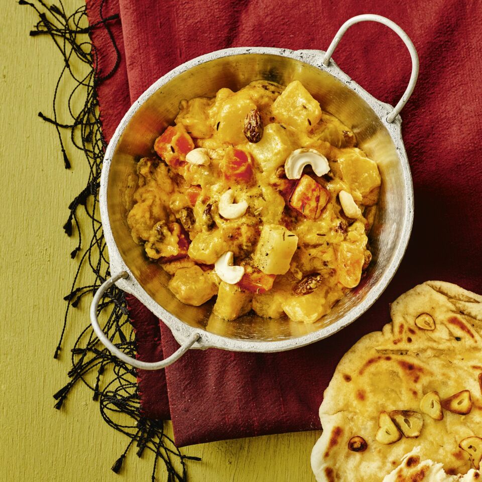 Herd ausschalten, Kardamom unter das Korma rühren und 5 Min. in der Resthitze ziehen lassen. Vor dem Servieren bei Bedarf mit Gemüsefond verdünnen und mit ein paar ganzen Cashews garnieren. Dazu passt Naan oder Basmati-Reis.