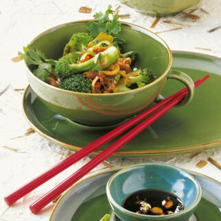 Bananenscheiben im Öl 1/2 Min. braten, an den Rand des Woks schieben. Zucchino, Paprika und Lauch unter Rühren bei starker Hitze 4 Min. braten. Banane mit Tomaten und Sauce untermischen und heiß werden lassen. Das Gemüse mit Zimt und Salz abschmecken. Mit Petersilie bestreut servieren.