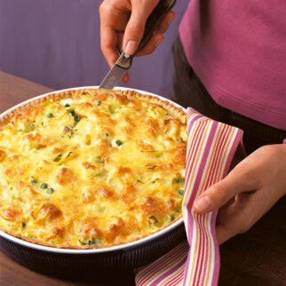 Den Gemüse-Quark-Kuchen im Ofen (Mitte, Umluft 160°) 35-40 Min. backen, bis die Masse gestockt und die Oberfläche goldgelb gebräunt ist.