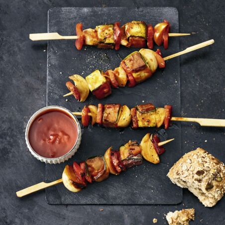Zucchino mit Küchenpapier trocken tupfen. Jedes Seitanstück mit einer Zucchinischeibe umwickeln. Seitan, Paprika und Schalottenviertel gleichmäßig verteilt abwechselnd auf die Holzspieße stecken. Das Ketchup mit dem Apfelsaft und ca. 60 ml Wasser in einem Schälchen glatt verrühren.