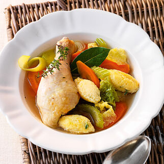 Gemüse, Fleisch und Tomaten lagenweise in den Römertopf® schichten, jede Lage salzen und pfeffern. Mit Kartoffeln abschließen. Zugedeckt bei 200° (Umluft 180°) 1 Std. 30 Min. garen.