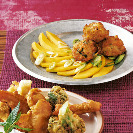 Öl im Wok erhitzen. Gemüsebällchen darin 5-6 Min. braten, bis sie rundum schön braun sind. Heiß auf den Mangoscheiben anrichten.