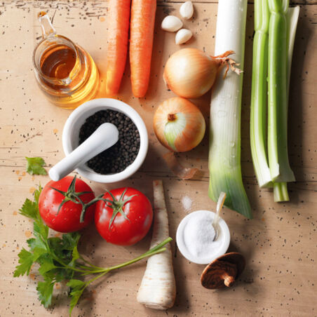 Bereitet man die Brühe wie beschrieben vor, ist das Gemüse noch bissfest und aromareich. Es kann mit etwas Butter und 2–3 EL der Brühe als Gemüsebeilage erhitzt und serviert werden. Oder das Gemüse mit Zitronensaft und Olivenöl marinieren, würzen und als Salat anbieten. In Profiküchen werden Ge- müsebrühen meist aus Gemüseschalen und -resten gekocht, die man später nicht mehr weiterverwendet. Für diese Version das Gemüse (oder Gemüsereste) grob schneiden und mit 1 1⁄2 l Wasser gut 1 Std. kochen lassen. Nach dieser Zeit ist das Gemüse sehr weich und hat fast allen Geschmack an eine gehaltvolle Brühe abgegeben.