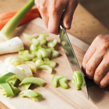 Selleriestangen waschen und putzen, Petersilienwurzeln und Möhren schälen. Sellerie in 5 mm dicke Scheiben schneiden, Möhren und Petersilienwurzeln in 3 mm dicke Scheiben.