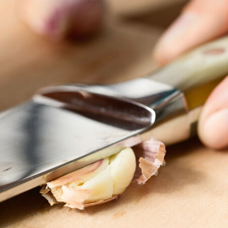 Die Knoblauchzehen mit der breiten Seite eines großen Messers leicht anquetschen, sodass die Schale ein wenig aufplatzt. Die Zehen schälen und in möglichst kleine Würfel schneiden, dann ganz fein hacken.