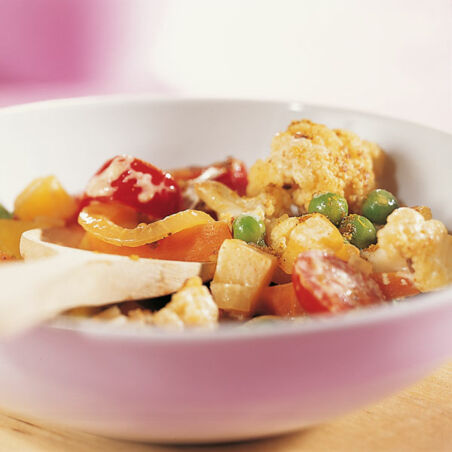 | gut 1 kg gemischtes Gemüse (z.B. fest kochende Kartoffeln, Möhren, Lauch, rote Paprikaschoten, Wirsing, Blumenkohl, Erbsen und Cocktailtomaten) | |