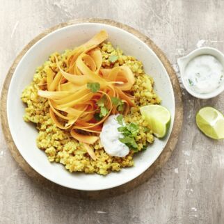 Diese bunte Bowl mit Gemüsenudeln aus Möhren ist besonders ballaststoffreich.