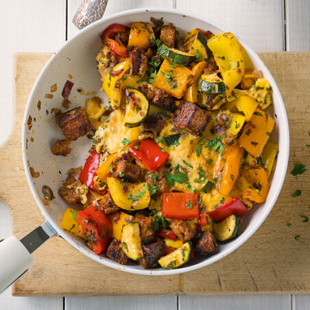 In dieser bunten Pfanne verstecken sich jede Menge sommerliches Gemüse, Eier und krosses Vollkornbrot.