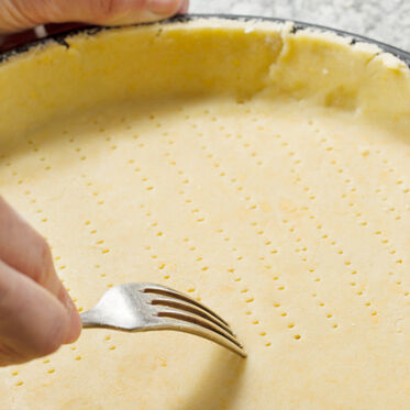 Teig in die Form legen, mit einer Gabel Löcher hineinstechen.