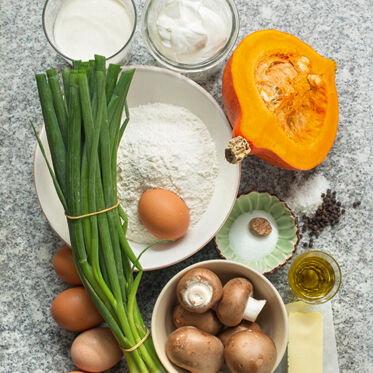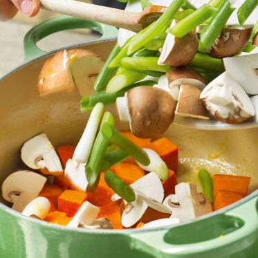 Kürbis mit Olivenöl oder Butter in einen kleinen Topf geben, salzen und zugedeckt 5 Min. dünsten. Pilze und Frühlingszwiebeln dazugeben, alles weitere 5 Min. dünsten.