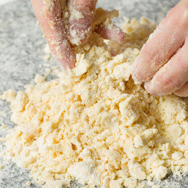 Alle Zutaten rasch mit den Fingerspitzen verkrümeln, damit der Teig nicht zu warm wird. Die Krümel rasch zu einer Kugel formen, in Frischhaltefolie wickeln und mind. 30 Min. im Kühlschrank ruhen lassen.
