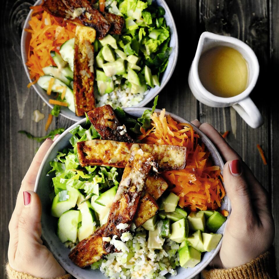 Für das Dressing den Limettensaft mit Cashew-Mus, 2 EL Wasser und den restlichen 3 EL Teriyaki-Sauce glattrühren. Den Reis auf Schüsseln verteilen und das Dressing darüberträufeln. Salat, Möhren, Avocado und Gurken darauf anrichten und alles leicht salzen. Dann den Tofu darübergeben und servieren.