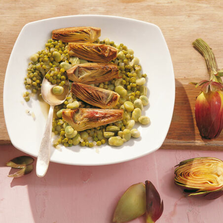 Artischocken, Dicke Bohnen und grüne Erbsen gehören in diesen Gemüseschmortopf aus Sizilien, der ganz einfach zuzubereiten ist.