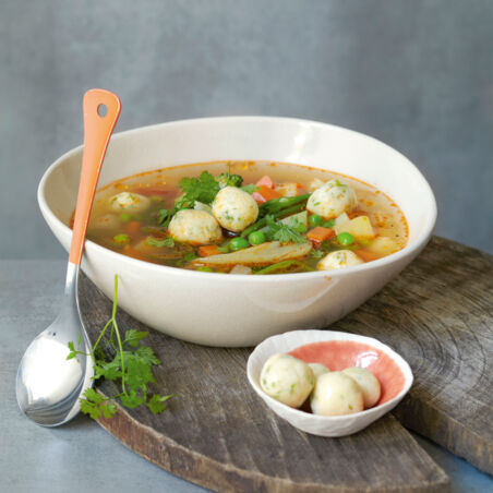 Nockerlfischen aus dem bunten Gemüseeintopf ist nicht nur bei Kindern der Hit. Mit den Klößchen wird übrigens auch eine einfache Brühe zur feinen Vorspeise.