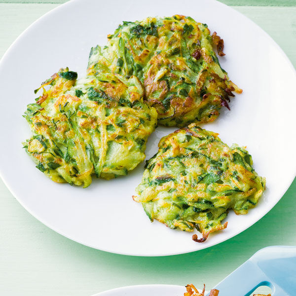 Öl in einer beschichteten Pfanne erhitzen. Vom Zucchiniteig esslöffelgroße Portionen abstechen, diese portionsweise ins heiße Öl setzen, flach drücken und jeweils bei mittlerer Hitze in 6-8 Min. von beiden Seiten braten.