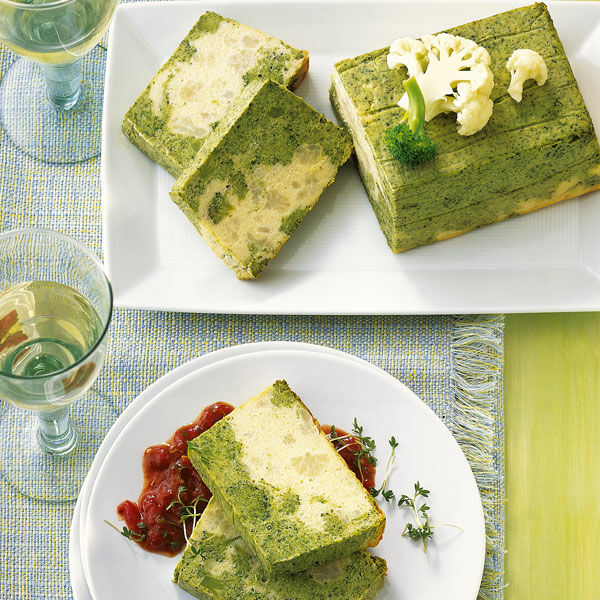 Servieren sie diese leichte Terrine aus Brokkoli und Blumenkohl mit einer fruchtigen Tomatensauce.