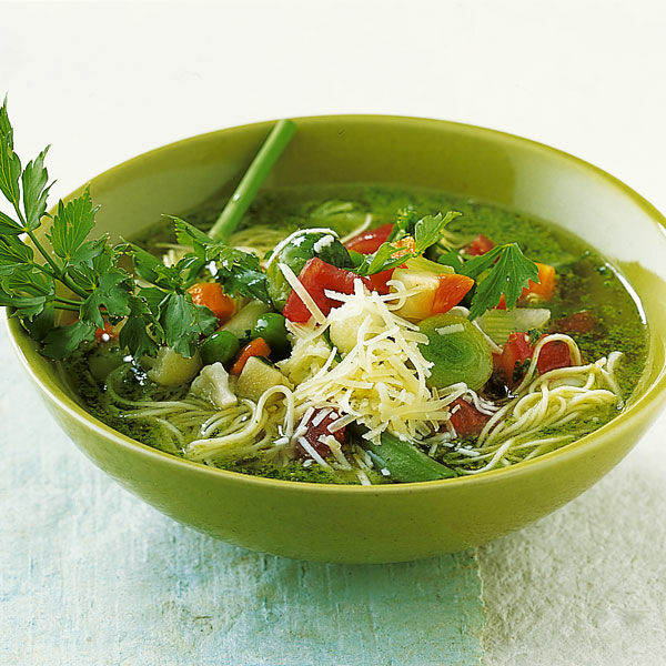 Tomaten überbrühen, häuten, entkernen und würfeln. Mit den Nudeln in die Suppe geben, 5 Min. kochen lassen. Mit Pesto, Salz und Pfeffer würzen. Käse aufstreuen. Mit Liebstöckel garnieren.
