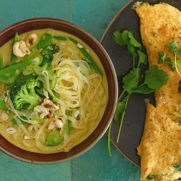Wok mit Öl erhitzen, Ingwer und Zwiebeln darin anbraten, Knoblauch unter Rühren mitbraten. Currypaste unter Rühren 1 Min. anrösten, mit Gemüsefond ablöschen, etwas einkochen lassen. Kokosmilch dazugeben, aufkochen lassen. Salzen und pfeffern. Gemüse und Nudeln unter Rühren erhitzen. Mit Zwiebelgrün und Nüssen bestreuen.