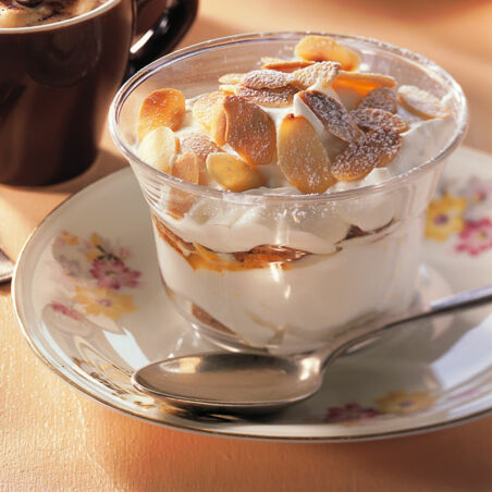 Zum Servieren die Mandeln in einer beschichteten Pfanne ohne Fett goldbraun rösten. Dick über die Creme streuen. Etwas Puderzucker darüber stäuben.