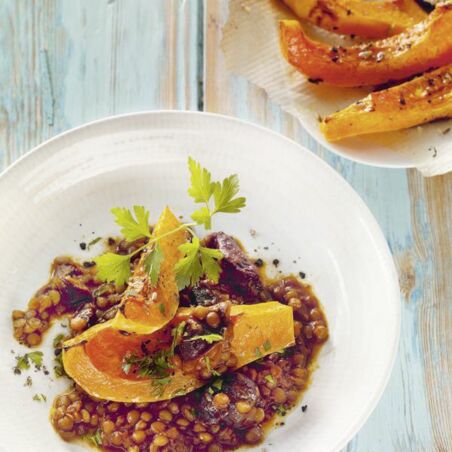 Die Petersilie waschen und trocken schütteln, die Blätter hacken. Die Linsen auf die vorgewärmten Teller verteilen und die Kürbisspalten daraufsetzen. Mit Petersilie bestreut servieren.