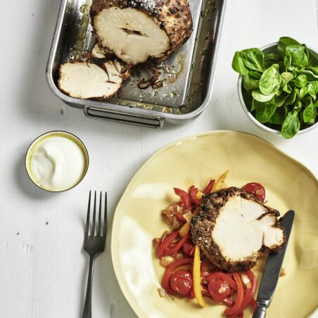 Toll vorzubereiten und überraschend: Sellerie im Ganzen wird durchs lange Schmoren unglaublich aromatisch und karamellisiert. Frische kommt durch das Paprikagemüse, den Joghurt und den Salat.