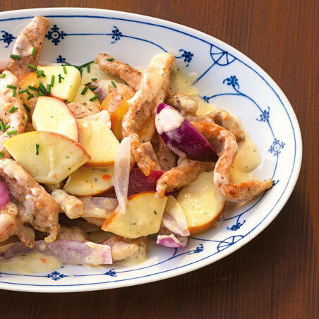 Geschnetzteltes wird in einer fruchtig-deftigen Sauce aus Zwiebeln, Äpfeln, Sahne und Calvados gegart. Dazu Salzkartoffeln oder Kartoffelbrei - perfekt!