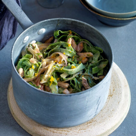 Das Fleisch unter die Sauce mischen und erwärmen. Das Basilikum unterrühren und die Sauce mit frisch gekochten Nudeln mischen. Sie schmeckt sehr gut zu Fusilli oder breiteren Bandnudeln.