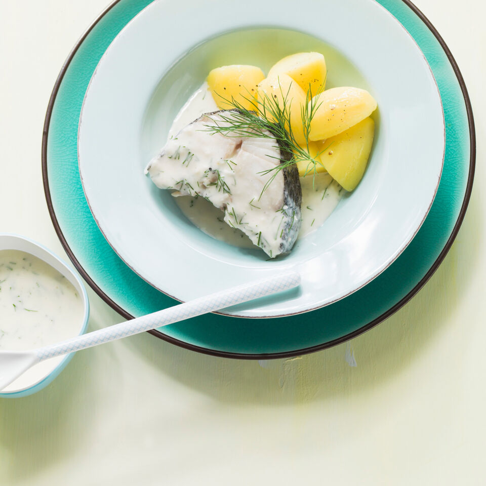 Die Kartoffeln abgießen und auf Teller verteilen. Fischkoteletts aus dem Sud heben und auf die Teller geben, etwas Sauce darübergießen. Restliche Sauce separat servieren.