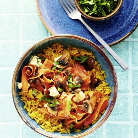 In der Zwischenzeit die Zwiebel schälen und in kleine Würfel schneiden. Pilze putzen, bei Bedarf mit einem trockenen Tuch abreiben, halbieren und in schmale Streifen schneiden. Die Möhren putzen, schälen und mit dem Sparschäler längs in dünne Scheiben hobeln.