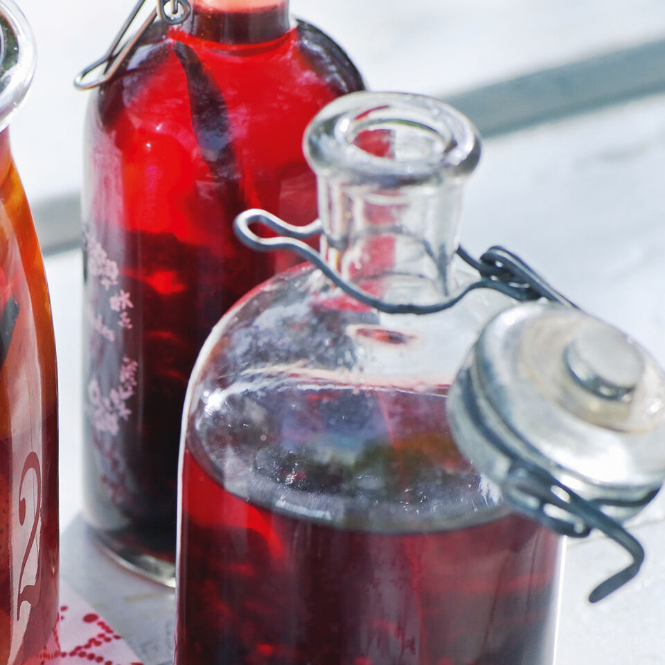 Am folgenden Tag Nelken, Pfefferkörner und Zimtstangen (am besten die ganzen Stangen einmal durchbrechen) mit Korn oder Wodka unter die Beeren rühren. Das Glas gut verschließen und für 4 Monate an einen möglichst warmen, sonnigen Ort stellen, dabei ab und zu einmal durchrütteln.