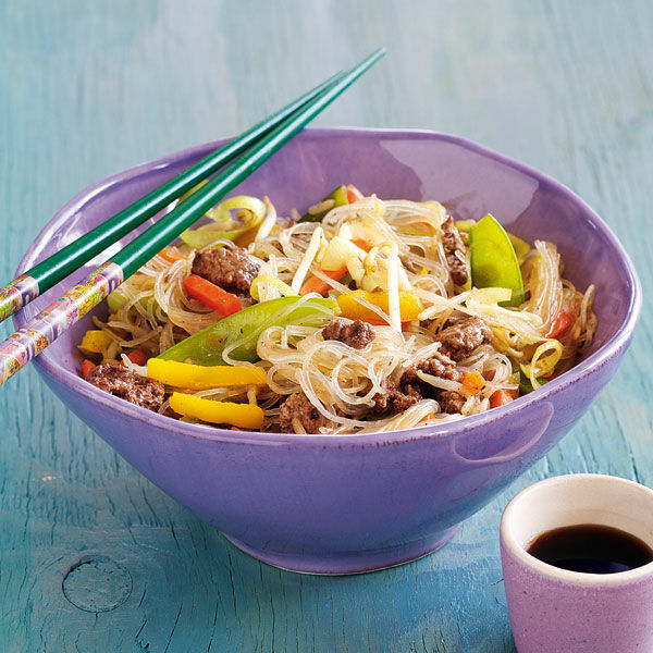 Asiatische Nudeln, asiatisches Gemüse, asiatische Gewürze. Wer Hackfleisch nicht so gern mag, kann für die Nudelpfanne auch Geschnetzeltes von Rind oder Geflügel nehmen.
