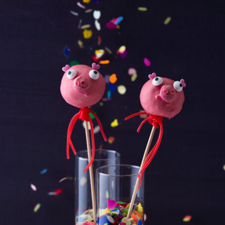 Einen Cake-Pop in die flüssige Glasur tauchen und den Überschuss abklopfen. Den Cake-Pop sofort mit Zuckeraugen, Zuckerherzen (Ohren) und Zuckerkonfetti (Nasenlöcher) dekorieren. Trocknen lassen. Mit den restlichen Pops ebenso verfahren. Die fertigen Cake-Pops mit Schleifen aus Fruchtgummischnüren verzieren.