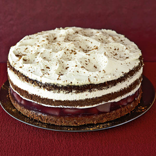 Boden zweimal quer teilen. Tortenring um den unteren Boden stellen. Birnen abgießen, dabei ¼ l Birnensaft auffangen. Birnen würfeln. Aus Birnensud, Glühwein und Tortenguss einen Guss herstellen. Birnenwürfel unterheben, auf dem unteren Boden verteilen und fest werden lassen.