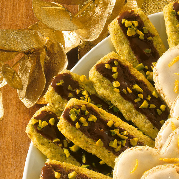 Die Stangen auf dem Blech abkühlen lassen, sonst zerbrechen sie. Zur Hälfte mit Schokoladenglasur überziehen und mit gehackten Pistazien bestreuen.
