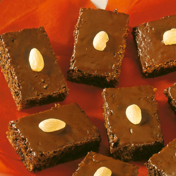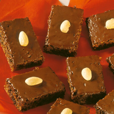 Die Schokoladenglasur im Wasserbad schmelzen lassen und das Schokoladenbrot damit überziehen. Die Glasur leicht antrocknen lassen. Das Schokoladenbrot in etwa 4 × 6 cm große Rechtecke schneiden.