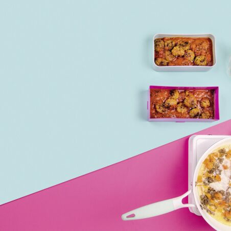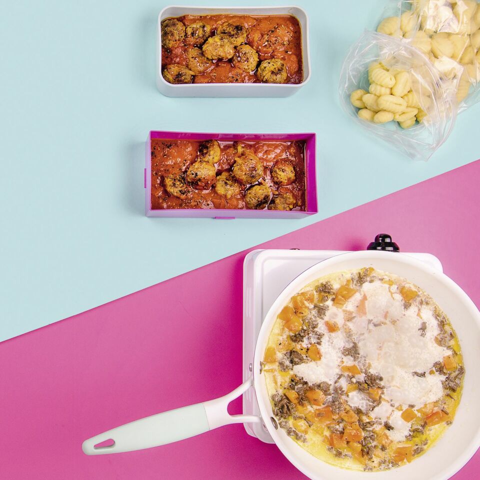 In einer großen Pfanne 2 EL Öl erhitzen und die Bällchen darin bei großer Hitze rundherum in ca. 10 Min. goldbraun und knusprig braten. Die Tomaten dazugeben und alles ca. 5 Min. köcheln lassen. Die Tomatensauce mit Salz und Pfeffer würzen und in zwei mikrowellengeeignete Boxen verteilen (Portion 1 und 2).