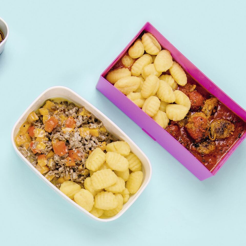 Die Gnocchi in reichlich Salzwasser nach Packungsanweisung gar kochen und in die vier Boxen verteilen (zu Portion 1, 2, 3 und 4).