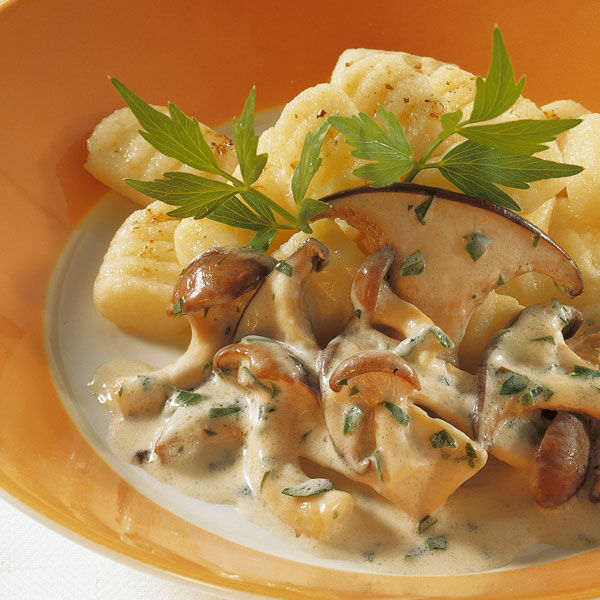 Frische Pilze putzen, in dünne Scheiben schneiden, mit Zitronensaft mischen. Gnocchi in Salzwasser 10 Min. ziehen lassen. Pilze 3-4 Min. in der Butter unter Rühren braten. Brühe und Sahne aufgießen, cremig einkochen, salzen und pfeffern.