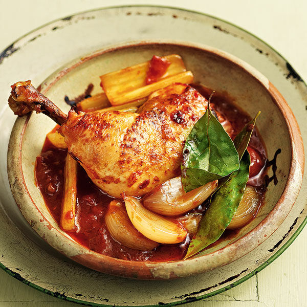 Die Hähnchenkeulen auf einer Platte mit dem Gemüse, Lorbeerblättern und der Sauce servieren.