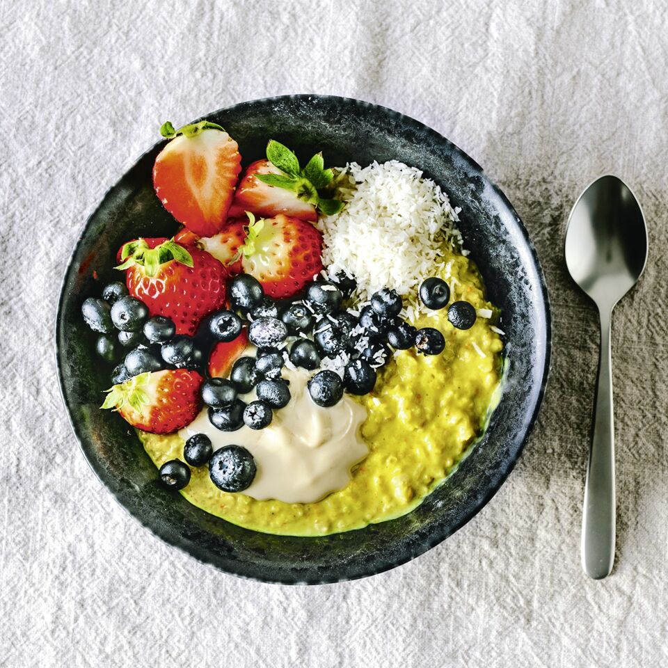 Goldener Milch werden heilende Wirkungen nachgesagt. Hier kommt sie in einem leckeren Frühstücks-Porridge daher – mitsamt frischem Beeren-Topping.