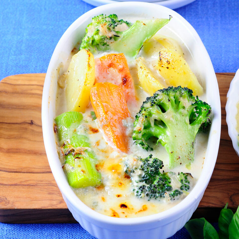Den Backofen auf 200° vorheizen. Gemüse salzen. Kartoffeln pellen und in Scheiben schneiden. Beides mit der Sauce in eine Auflaufform schichten. Mit 50 g Gorgonzolaflöckchen belegen und im Ofen (Mitte, Umluft 180°) 25-30 Min. überbacken.