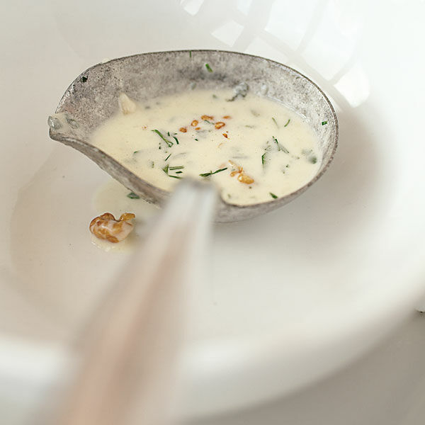 Die Walnüsse fein hacken. Petersilie abbrausen, trockenschütteln, Blättchen abzupfen und ebenfalls fein hacken. Nüsse und Petersilie unter die Sauce rühren, vorsichtig erhitzen. Mit Nudeln wie Penne, Tagliatelle oder mit Gnocchi servieren.