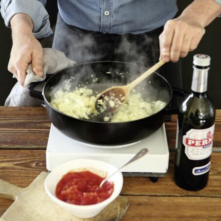 Das Öl in einem Suppentopf erhitzen. Die Zwiebeln, den Knoblauch und die Fenchelwürfel darin bei mittlerer Hitze andünsten, bis alles leicht zu bräunen beginnt (Bild 1). Die Tomaten dazu- geben und alles unter Rühren 2 - 3 Min. weiterdünsten. Mit der Hälfte des Pastis ablöschen und diesen unter Rühren einkochen lassen. Mit übrigem Pastis und mit dem Tomatensaft ablöschen, wieder einkochen lassen.