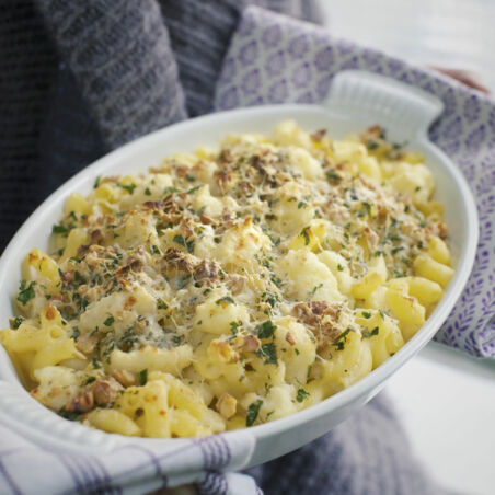 Backofen auf 200° vorheizen. Die Nudeln abgießen, abtropfen lassen und in einer flachen Auflaufform mit der Sauce mischen. Die Nüsse mit Petersilie und Parmesan mischen und auf die Nudeln streuen. Im Backofen (Mitte) in 5 Min. goldbraun gratinieren.