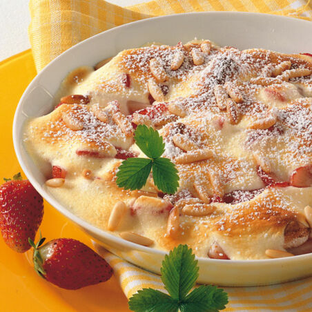 Die Schmandmasse auf den Erdbeeren verteilen, mit den Pinienkernen bestreuen. Im heißen Ofen (Mitte) etwa 20 Min. backen, bis die Oberfläche gebräunt ist. Mit Puderzucker bestäubt servieren.