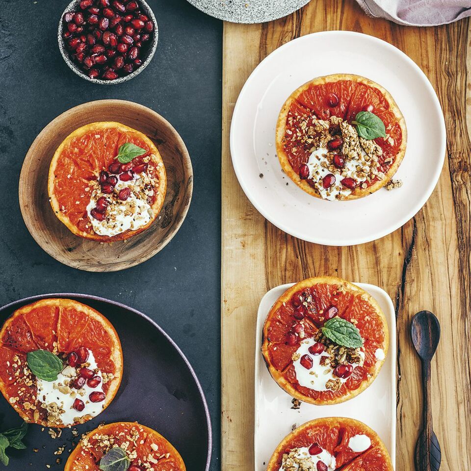 Inzwischen den Granatapfel entkernen. Die Grapefruithälften mit je 1 TL Kokosjoghurt, Granatapfelkernen und frischer Minze toppen.