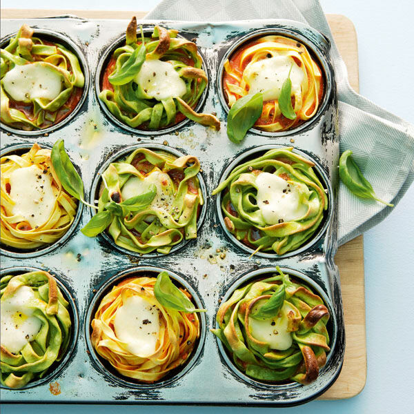 Inzwischen die Nudeln getrennt in reichlich kochendem Salzwasser in 6-8 Min. bissfest garen. Den Backofen auf 180° vorheizen. Die Vertiefungen einer Muffinform einfetten. Nudeln abgießen, kalt abschrecken, zu Nestern formen und in die Vertiefungen der Form setzen.